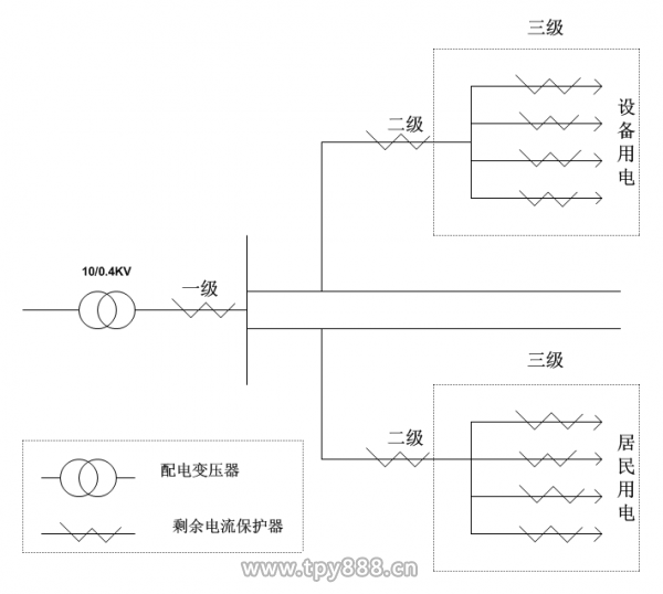 為了縮小發(fā)生人身電擊事故和接地故障切斷電源時引起的停電范圍,通常在供電線路的不同地點安裝不同型號的剩余電流動作保護(hù)裝置,以形成分級保護(hù)。根據(jù)用電負(fù)載及線路情況,一般分兩級或三級保護(hù)。圖5所示的分級保護(hù)模式是一般形式的保護(hù),適用于農(nóng)村電網(wǎng)、中小型配電變壓器(160kVA以下)供電的架空配電網(wǎng),其主要的負(fù)載多為農(nóng)副業(yè)加工及居民生活用電。