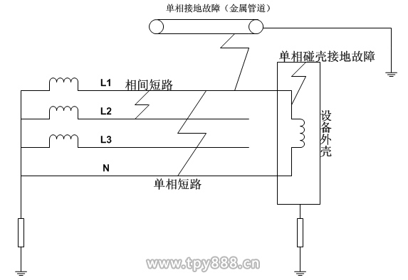 電氣火災(zāi)就是指配電線路及電氣設(shè)備由于設(shè)計、安裝、使用不當(dāng)或者接觸不良、短路等原因而引起的火災(zāi)。其中,短路所引起的火災(zāi)的概率-高,而短路又可分為一般性短路和接地故障。一般性短路,是指供電線路之間由于絕緣性能降低,從而導(dǎo)致的相線與相線、相線與零線之間的短路;接地故障,是指相線與接地導(dǎo)體、相線與大地之間的短路,它是由于相線與接地導(dǎo)體、相線與大地之間的絕緣性下降所導(dǎo)致的。根據(jù)統(tǒng)計,因為接地故障而引起的火災(zāi)占短路原因而引起火災(zāi)的絕大多數(shù),它是較為常見的電氣火災(zāi)起因。此外漏電電流使得部分的電流流入大地,造成了能源浪費;當(dāng)人體接觸到故障電壓引起觸電電擊,危及生命安全。低壓配電系統(tǒng)短路故障示意圖,如圖1所示。
