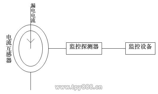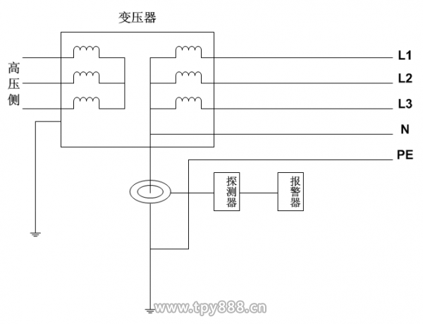 對于接地形式為TN-S的配電系統(tǒng),可以檢測系統(tǒng)的總體絕緣狀態(tài),即檢測系統(tǒng)的總漏電電流。電流互感器安裝于變壓器接地線中(如圖6所示)以提取漏電的信號,探測器、報警器(監(jiān)控設(shè)備)安裝于相應(yīng)的位置處。