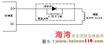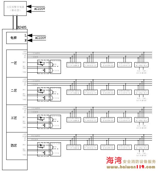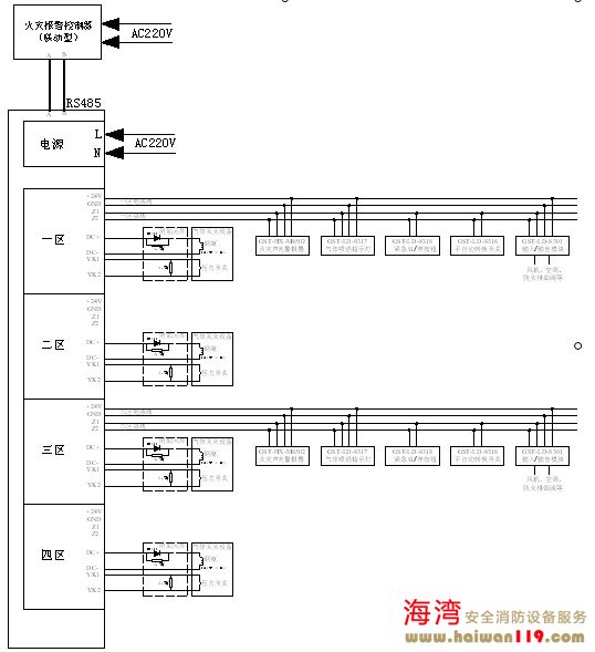 GST-QKP04/2海灣消防氣體滅火控制器可通過本地網卡與火災報警控制器(聯動型)聯網,接線示意圖如圖5-10所示。 各區驅動鋼瓶電磁閥有源輸出的布線方式如圖5-11所示。附加元件應置于線路的末端、接近于鋼瓶電磁閥處。 GST-QKP04/2海灣消防氣體滅火控制器典型接線圖如圖5-12所示。 具有主備兩個鋼瓶組切換使用的氣體滅火控制器系統接線圖如圖5-13所示。通過設置1區和2區關聯、3區和4區關聯可以實現兩鋼瓶組的關聯使用――當啟動主鋼瓶組后沒有檢測到壓力開關的回答信號時氣體滅火控制器會自動啟動備用鋼瓶組。
